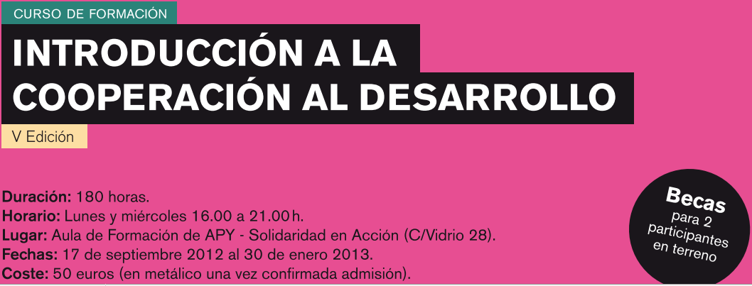 El curso de Introducción a la Cooperación al Desarrollo de 180 horas de duración. Esta acción formativa que tiene un coste de 50 euros se desarrollará desde el 17 de septiembre de 2012 al 30 de enero de 2013 en dos sesiones semanales (lunes y miércoles) en horario de 16.00 a 21.00. Este curso tiene como objetivo dotar de herramientas e instrumentos a personas vinculadas al tejido asociativo con interés en fortalecer sus conocimientos en el ámbito de la Cooperación al Desarrollo. Asimismo, está previsto que dos personas de entre el alumnado disfruten de una beca para realizar prácticas en el terreno.