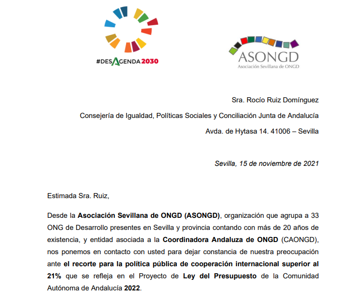 La Asociación Sevillana de ONGD, en coordinación con Málaga Solidaria, Córdoba Solidaria, Coordinadora Granadina de ONGD y Coordinadora de ONGD de la provincia de Cádiz -que agrupan a más de 100 ONGD en Andalucía- hemos enviado simultáneamente una carta a la consejera de Igualdad, Políticas Sociales y Conciliación para hacer constar nuestra “preocupación ante el recorte para la política pública de cooperación internacional superior al 21%”.