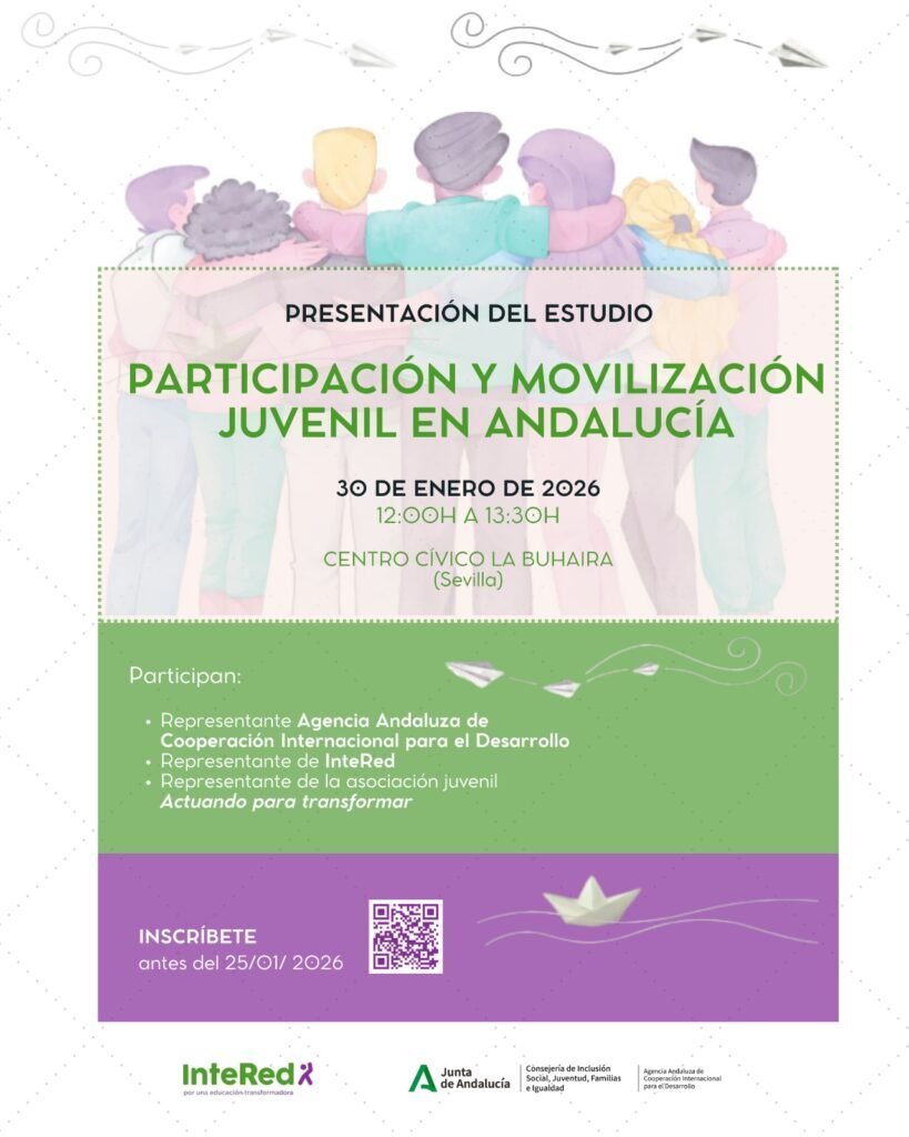 La Fundación InteRed y la Asociación Actuando para Transformar tiene el gusto de invitarte a la presentación del estudio que han realizado durante el año 2025 sobre la participación y movilización juvenil en Andalucía. Quieren compartir el análisis que han realizado y las conclusiones a las que han llegado, así como ampliarlas y enriquecerlas con un coloquio posterior en el que intercambiemos experiencias.