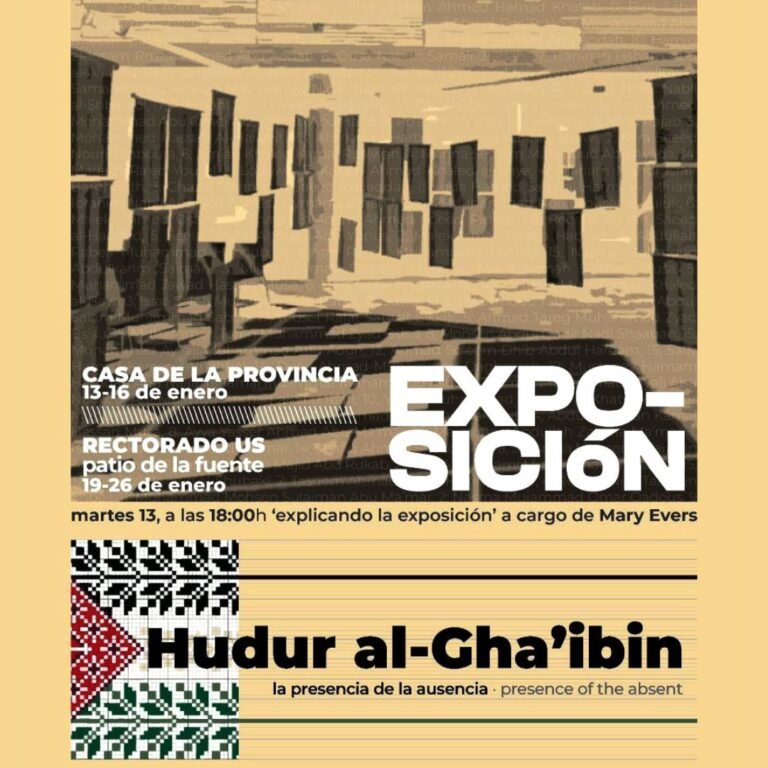 Este mes de enero llega a Sevilla la exposición «Hudur al-Gha’ibin», la presencia de la ausencia, que rinde homenaje a las vidas perdidas en Gaza entre 2023 y 2025 a través del Tatreez, el bordado tradicional palestino, una forma ancestral de expresión cultural transmitida de generación en generación, donde patrones y colores comunican identidad, historia y resistencia; cada puntada cuenta historias de la vida, el origen y la herencia palestina, plasmados en vestimentas y objetos, y se ha convertido en un poderoso símbolo de la identidad nacional y la resiliencia cultural.